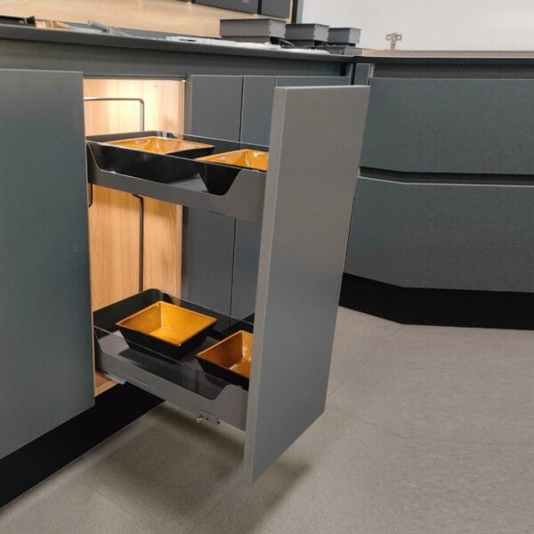 Ideal solution for kitchen narrow base cabinets where small and different things can be stored in an organized manner. Built-in SOFT CLOSE mechanism. Comes in full set with Baskets, Concealed slides & a Mounting kit. Available in four sizes: 105mm (For 150mm cabinet) 155mm (For 200mm cabinet) 205mm (For 250mm cabinet) 255mm (For 300mm cabinet)