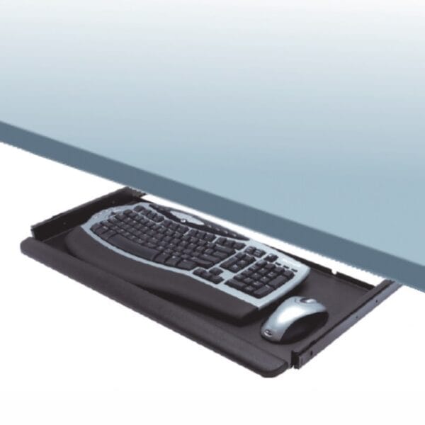 Made for an extra-large multimedia keyboard. Has specially designed palm rest. Height adjustment on mounting brackets. Smooth quiet movement with ball bearings. Removable drawer with latches. Special pressure lock at extended position.