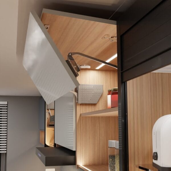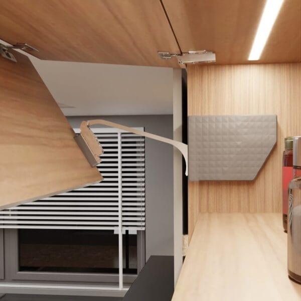 Ideal for overhead hanging cabinets. Folding type doors in open condition for space saving. The kit consists of Mechanism with Cover, Hinge Clip on Bracket, Folding Hinge (2 nos), Allen Key and Self Tapping Screws. Available in two lengths for different sizes of Cabinets.
