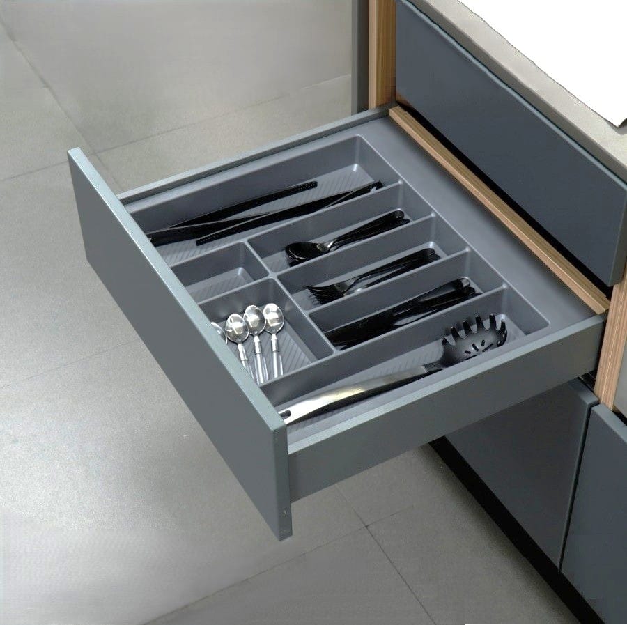 Multiple compartments keep cutlery and tools neatly organised Diagonal stripes pattern tray surface for better hold Diamond pattern top for an elegant look Height: 55mm and Depth: 420-490mm Available in 7 different cut-able widths to fit any drawer
