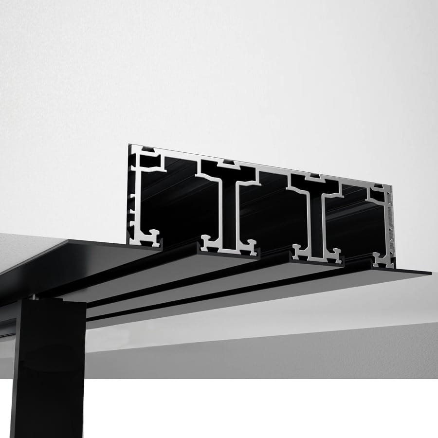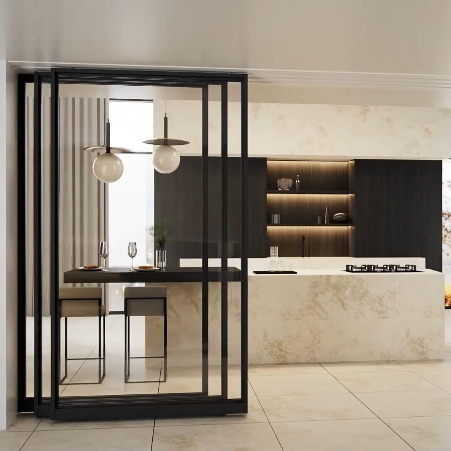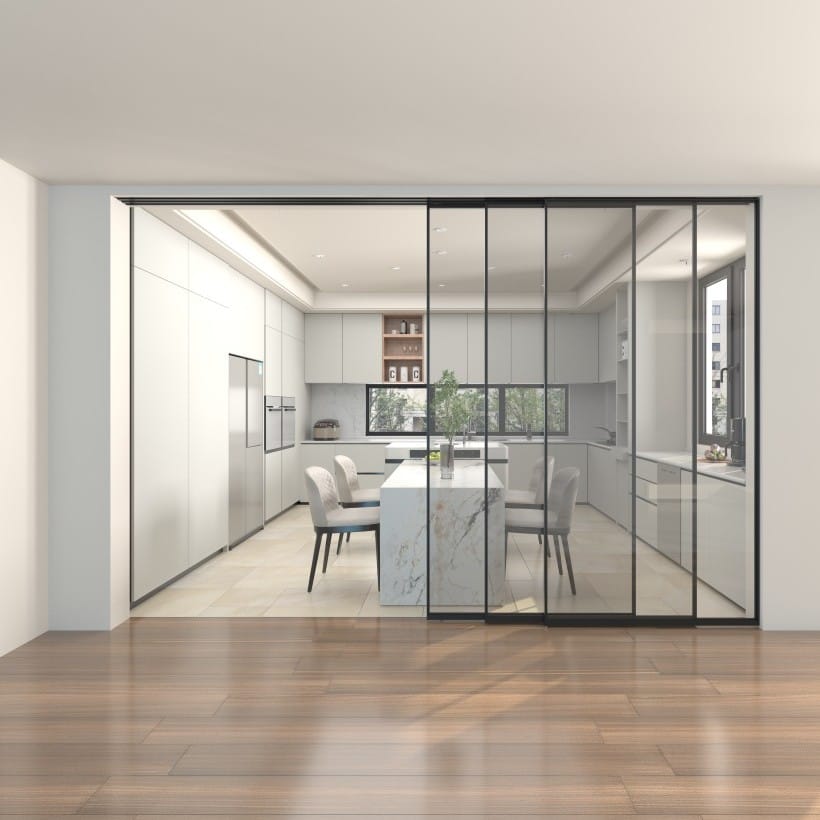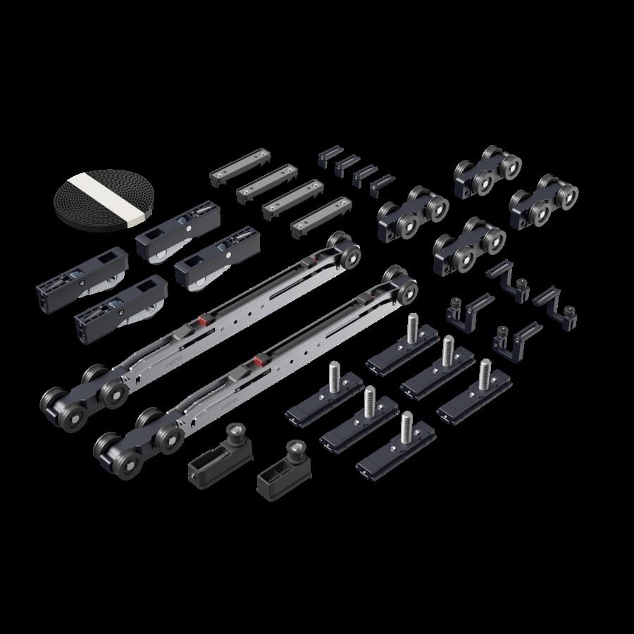 Specially engineered linked sliding partition system designed for 3-door glass installations. The interlocking rail system makes all 3 doors move together smoothly and in perfect sync. Clean floor look with no bottom track. Rollers guide the door while the top-mounted system stays stable with anti-sway support and won’t sag over time. Perfect for elevating any…