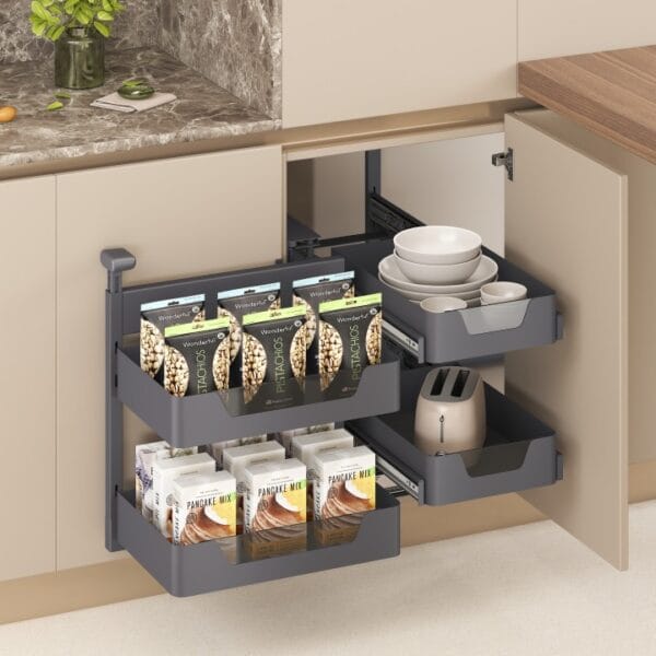 Convert your kitchen’s dead corner into a smart storage with magic corner max 90 glass baskets. For access, pull out and twist 90° for the first 2 baskets & to reach the other 2 baskets, pull out individually. Ensures smooth and quiet closing with soft-close mechanism. Load capacity: 5kg per basket. Cabinet Internal Dimensions: Width:…