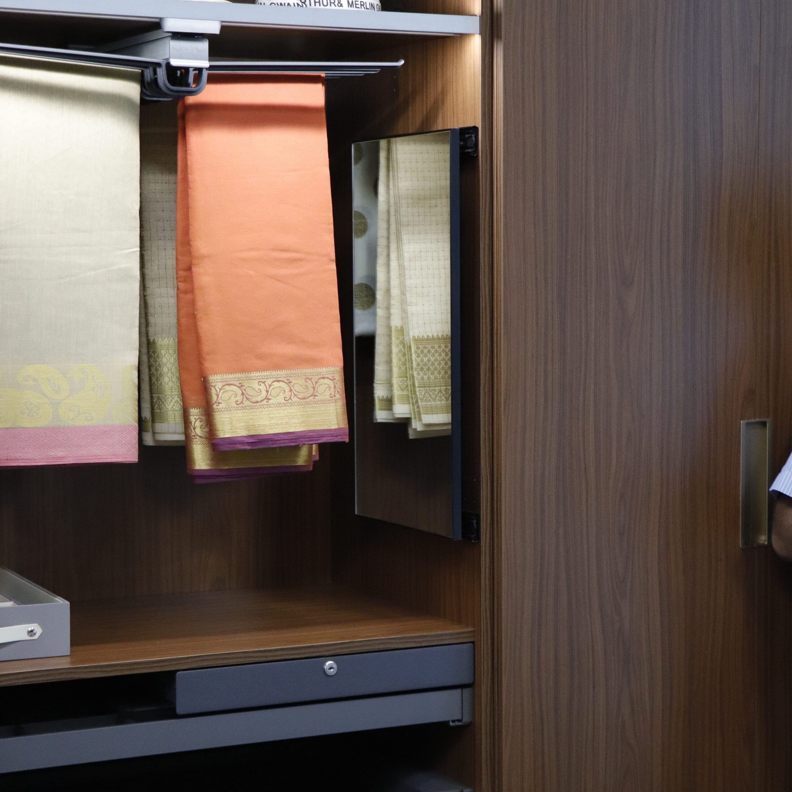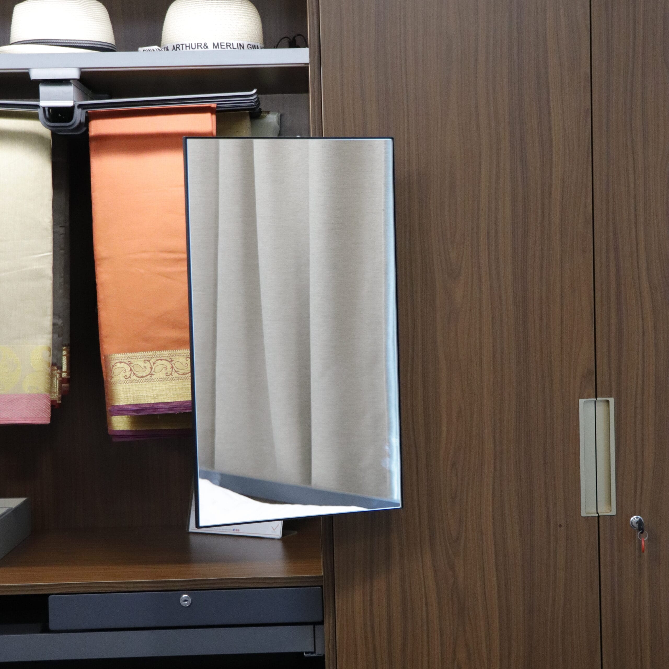 Ideal for Wardrobes with folding sliding doors, 180º opening shutters, walk in wardrobe, etc. Used minimum spaces of the cabinet and eliminates the need for a separate dressing table. Can be pulled out and rotated by 90º. Minimum width required for rotation is 230mm. Full height of the mirror ensures a better view.
