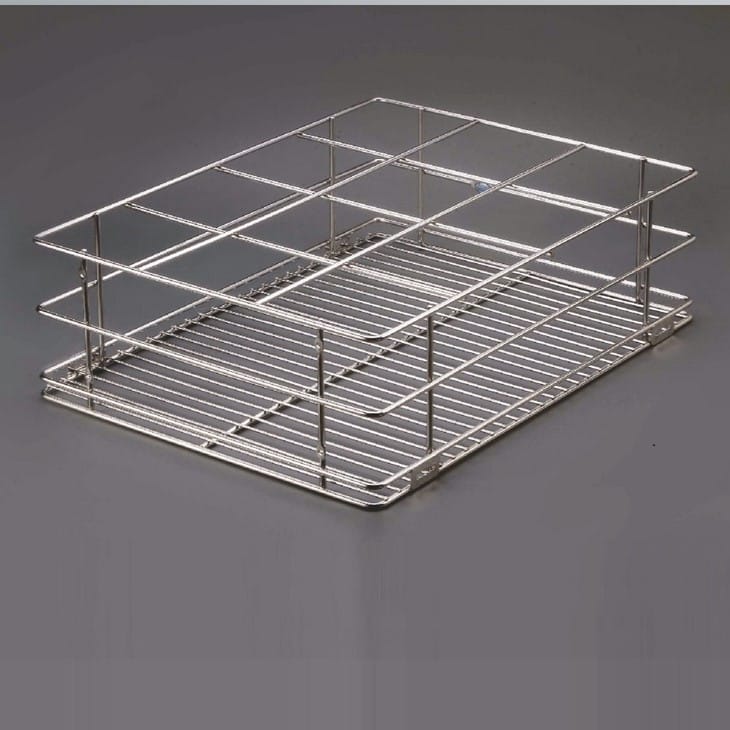 For storing bottles conveniently. Manufactured out of stainless steel 304 grade and electro polished. Designed to be used with ‘Ebco’ Sleek Telescopic Drawer Slides and Heavy Duty Telescopic Drawer Slides by direct assembly onto mounting plates provided on all baskets.