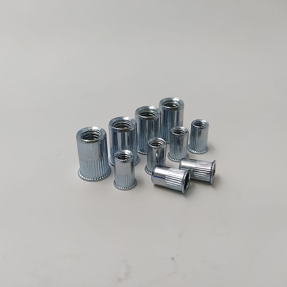 Rivet nut for steel furniture. One-piece internally threaded & vertical knurling from the exterior for superior grip. It can be used while working from one side of a panel. Rivet nuts provide strong fastening threads in thin panels. Ideal for steel & steel+wood furniture.