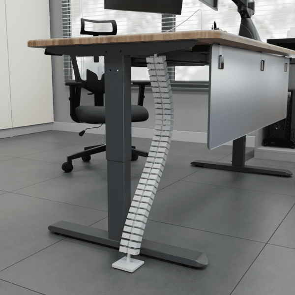 Used at work stations or desks to neatly conceal electrical and data cables separately. It enhances the aesthetics of your work space. Manufactured out of plastic and is flexible. System 32 compatible. Includes a built-in counter weight at base.