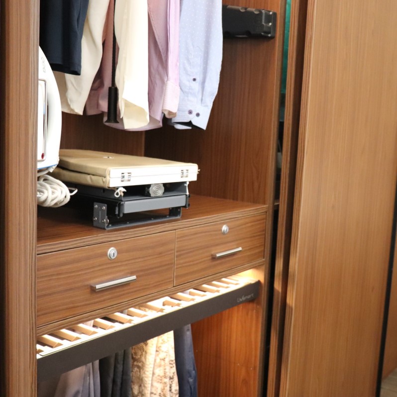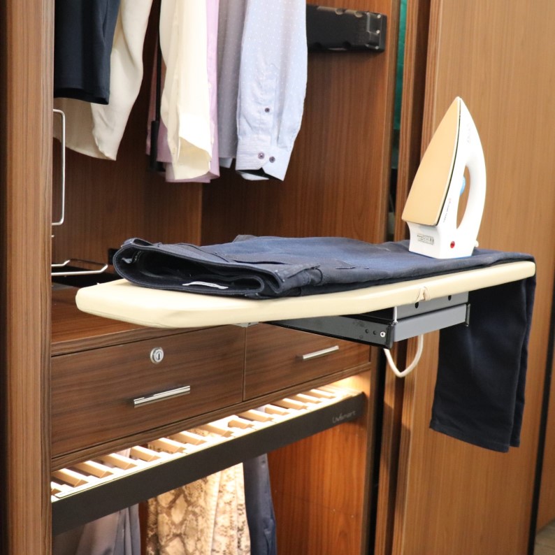 Aesthetically designed, space saving ironing board which slides in the wardrobe easily. Easy to use in standing position as the board can be easily rotated to 180° for left and right hand side positions. Practical in use and can be fitted on any shelf. Folds in half and slides in for easy storage. Finish: Anthracite