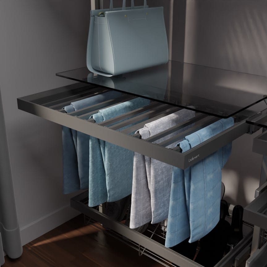 Wardrobe Pullout 2 – Trouser / Saree is an absolute novelty due to its versatility and its ability to take advantage of usually empty wardrobe space
